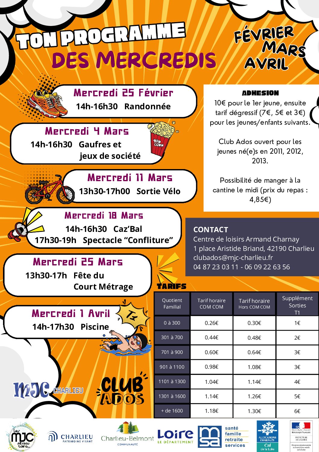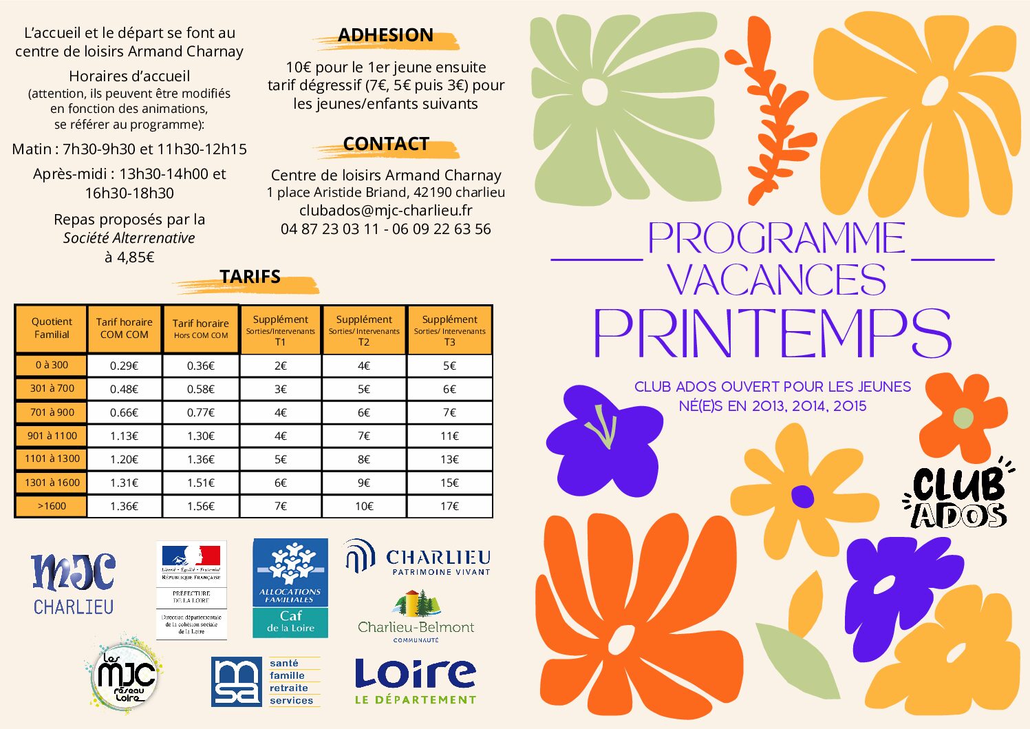 Le Club Ados fait parti de l’Accueil de loisirs qui est soutenu par la Mairie de Charlieu, par la Communauté de Communes de Charlieu-Belmont, par la caisse d’Allocations Familiales. Il est déclaré auprès de la Direction Départementale de la Cohésion Sociale.