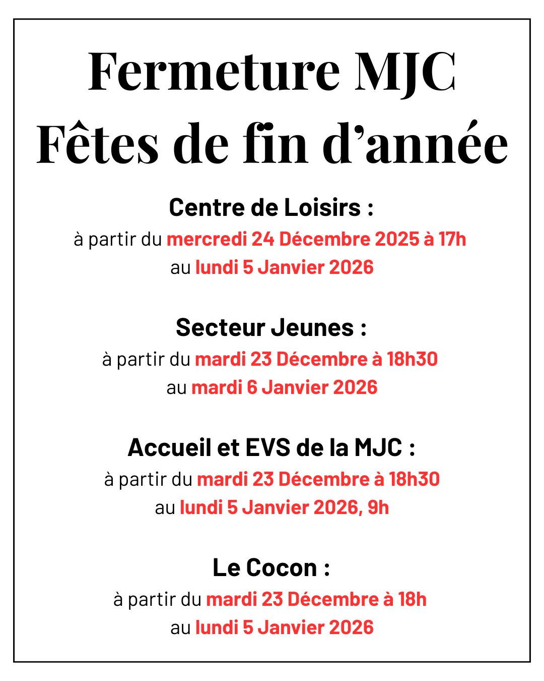 Fermeture fêtes de fin d’année
