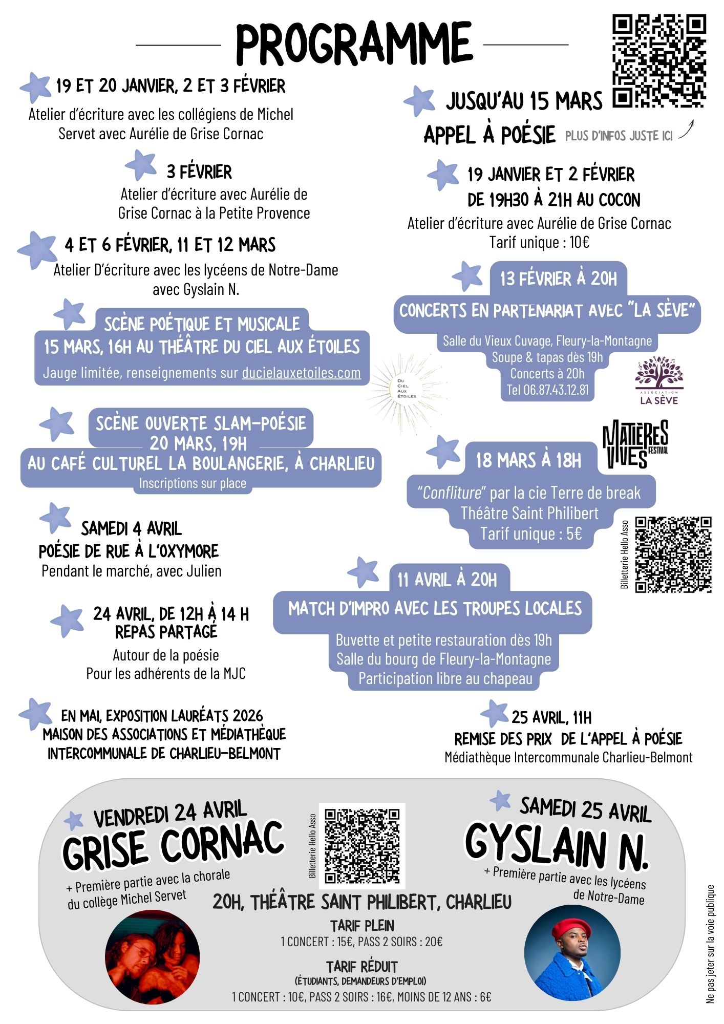 Poème à adresser jusqu’au 20 mars 2026, par mail à poesie42190@gmail.com ou par courrier à la MJC de Charlieu